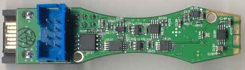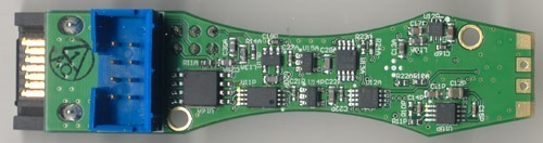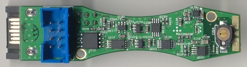 The LMH6518 is a single-chip solution for oscilloscope front-ends that is almost perfect for this scenario. It’s a 900 MHz, digitally controlled variable gain amplifier (VGA) with the added feature of an auxilliary output that’s well-suited for functioning as a trigger channel; conveniently, a SATA cable has two differential pairs, so we allocate one for measurement and one for trigger. We also strap a conventional 8-pin ribbon cable to the SATA cable for passing power and I2C.