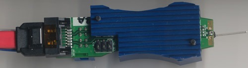 However, the design isn’t quite perfect. The LMH6518 burns a lot of power – a little over a watt; and the pre-amp plus power regulators add about another watt overall to the probe’s power footprint. Two watts isn’t that bad on an absolute scale, but two watts in the palm of your hand is searing hot; the amplifier chip gets to almost 80C. So, I designed a set of custom aluminum heatsinks for the probes to help spread and dissipate the heat.