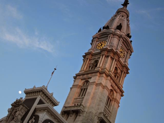 My husband and I, following an early dinner at the fabulous Fork Restaurant, miss our train by 10 seconds and walk the length of the city to consume the following hour. We see the moon rising over City Hall. Boarders take over Love Park. The lights go on above my river.
