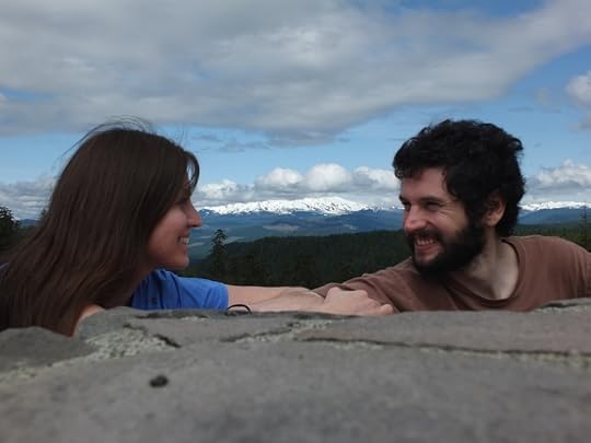 The bottom of Mount St. Helens is visible (the rest is behind clouds) between my husband and me.