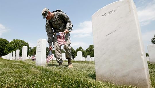 A member of the Third U.S. Infantry Regiment places flags on graves in Section 60 during a "Flags-In" ceremony May 22 at Arlington National Cemetery near Washington. The soldiers placed American flags in front of more than 220,000 graves. (CNS photo/Kevin Lamarque, Reuters)