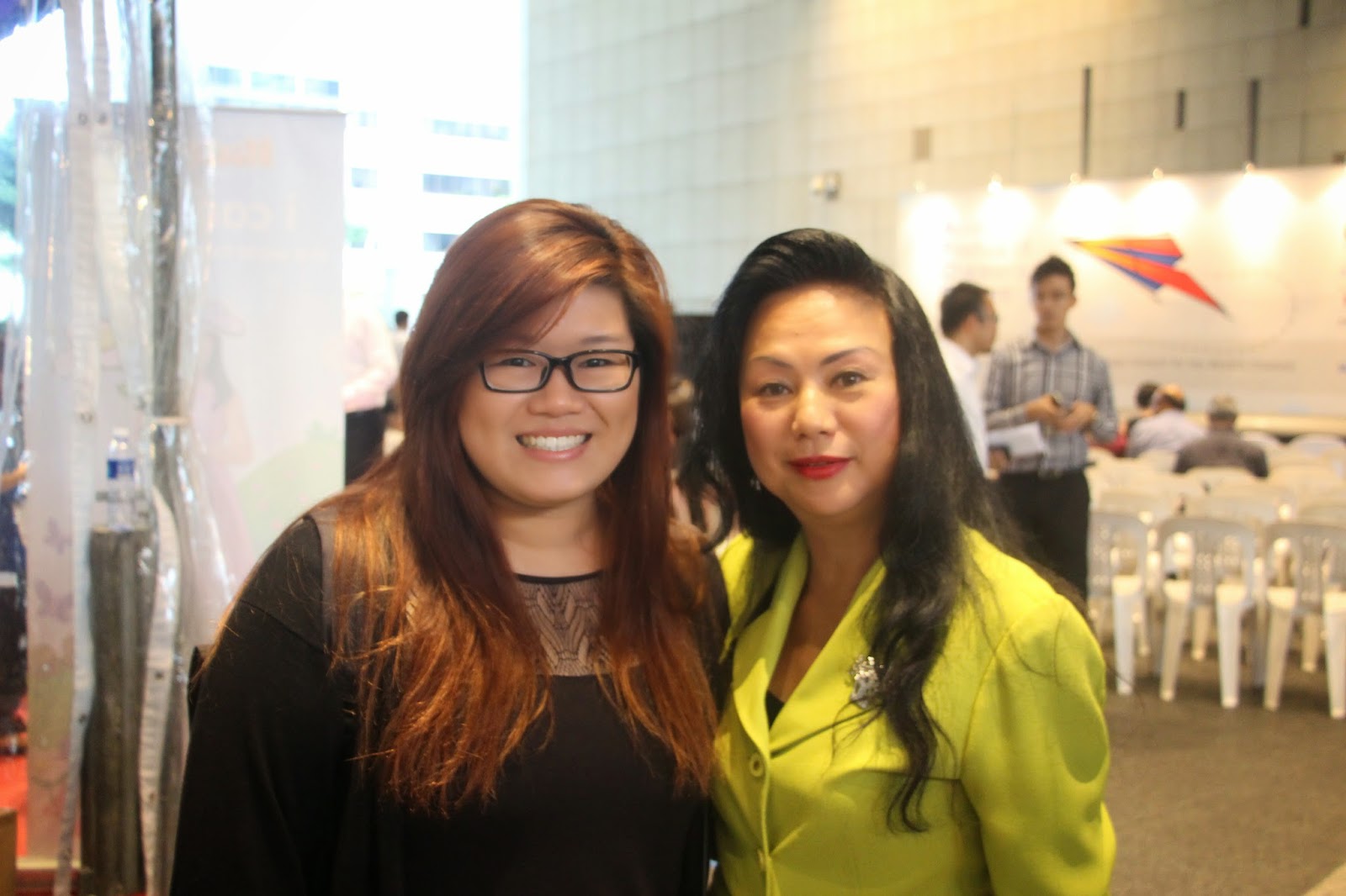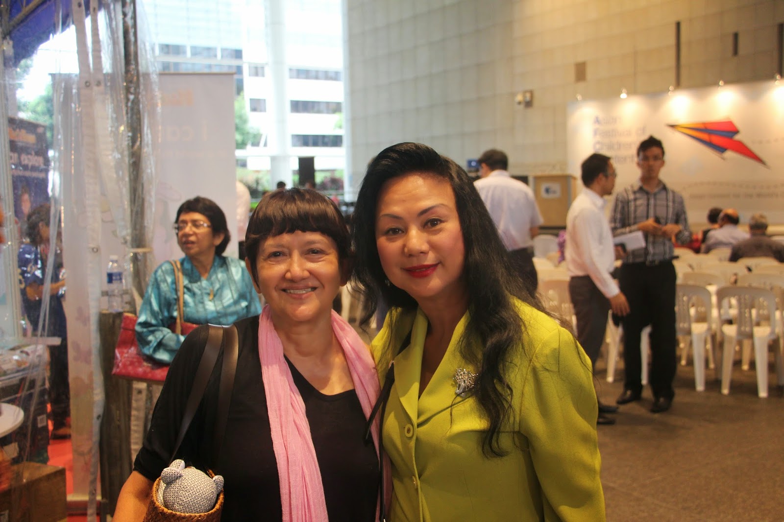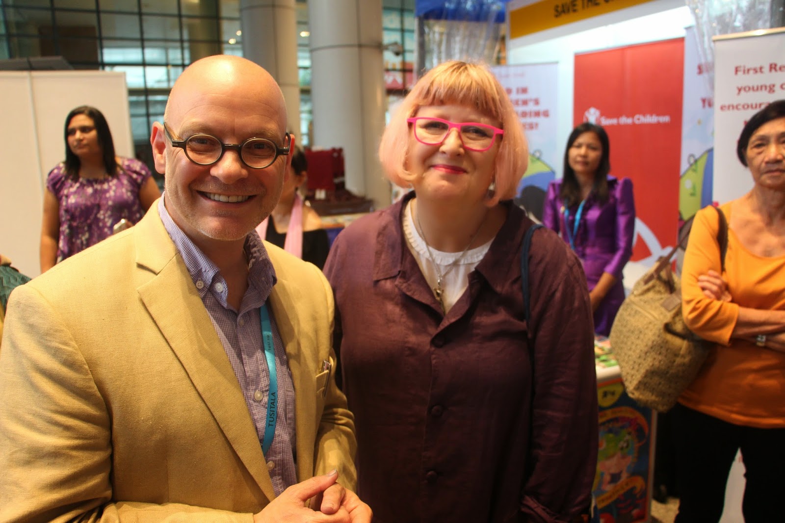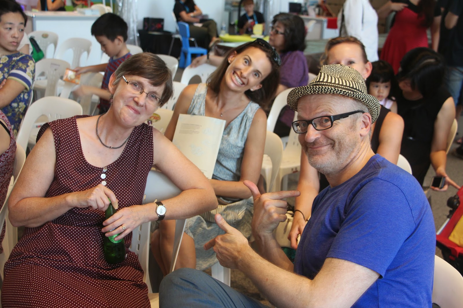 Emma, Andrew, Sarah and Linda.As we headed back downstairs we spotted Kelvin and Denise from Closetful of Books at the drop-off point. Denise is a huge admirer of AFCC Board of Advisors Chairman Claire Chiang, so Auntie Susanna and I took the opportunity to introduce her to Claire. There's no need to describe Denise's reaction as you can see it for yourself from the photo below.
