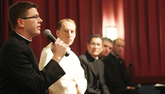 "Six priests walking into a bar..." could open a joke. But on a Friday night in May, a Dominican and five diocesan priests walked into a Dave and Busters in Providence Place Mall to share a meal with some 150 young people, answer their questions, and witness to the Gospel.