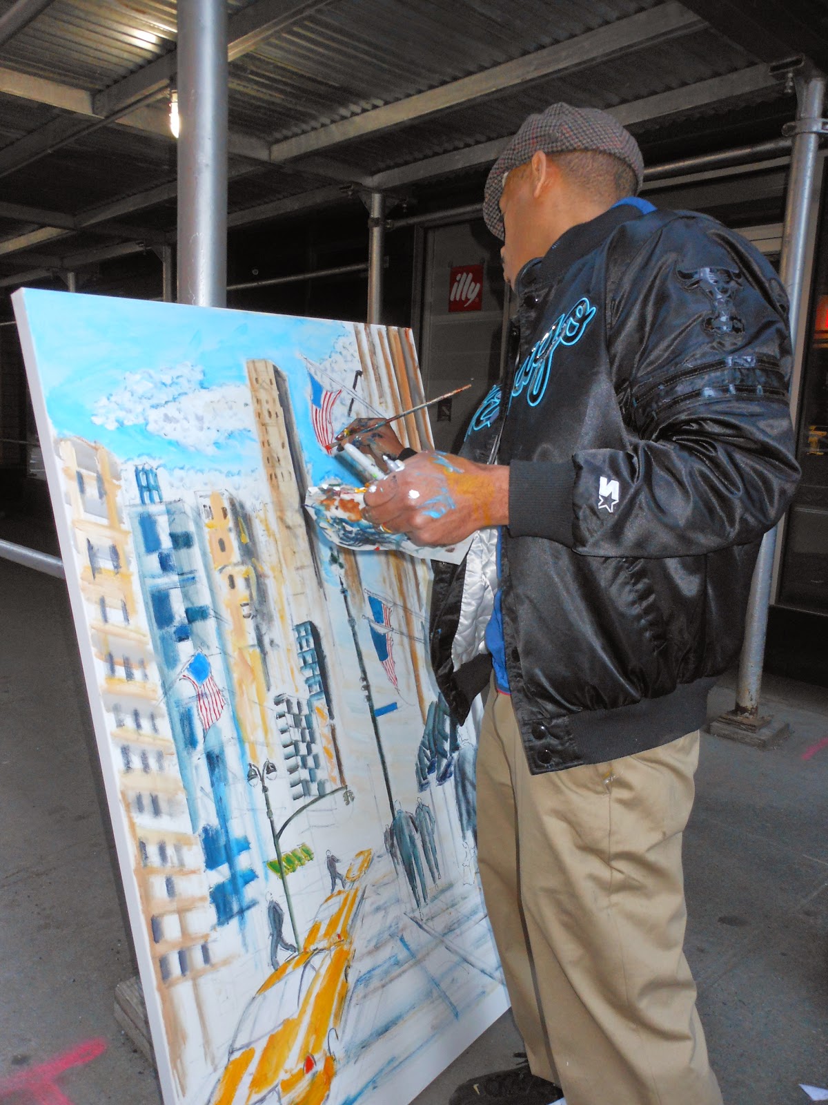 This guy is fantastic, very creative and a damned hard worker. Every day he drags his easel, paints, sharpie, markers and his bag of goodies to a different NYC location and works his butt off drawing first with the sharpie markers then painting. Enrico Miguel Thomas is the only artist I've ever seen to begin with markers instead of pencils. His works shows movement and he paints the entire day then retires to his studio where he finishes his works, perfecting their balance.