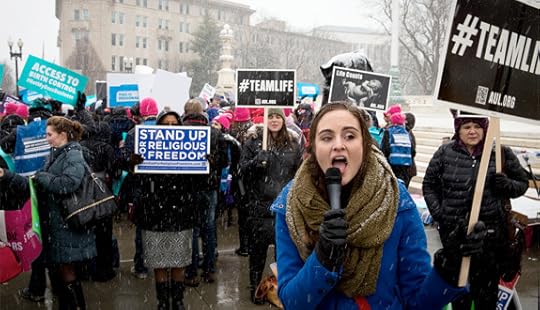 A woman leads a chant in front of the U.S. Supreme Court in Washington against the federal government's contraceptive mandate March 25. (CNS photo/Tyler Orsburn)