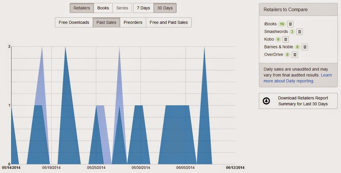 Yesterday (06/11) they came out with a great new tool that gives you daily sales updates for iBooks, Kobo, Barnes & Noble, and Smashwords. You can find it at the top of your dashboard in the sales reporting box. Click on daily sales, and it will take you to the page shown below.