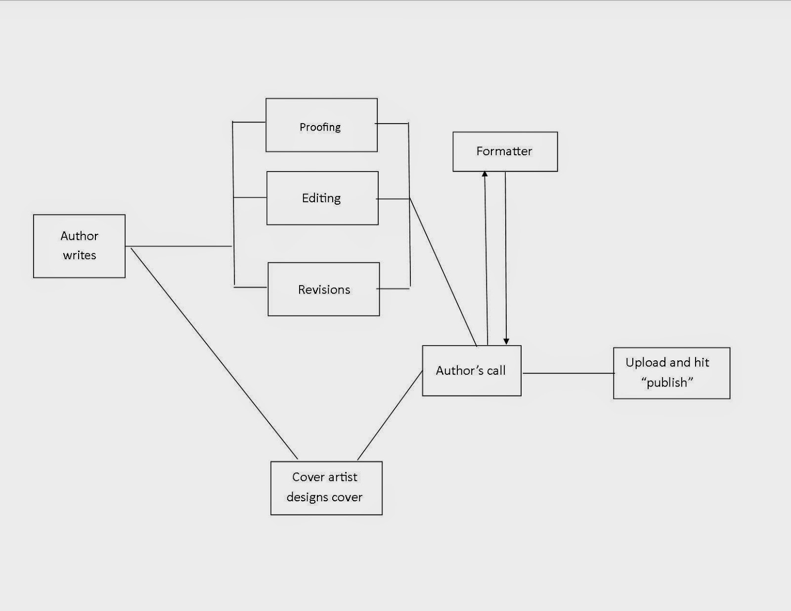 Eh, not quite. If you were traditionally published and used the model from the first flow chart, yeah, you would be. All you could do then is hope that the publisher keeps all their promises and that someday you’re popular enough with readers to make demands regarding placement and royalties and maybe even make other publishing houses sit up and take notice. Not so much at this point, but you are done.