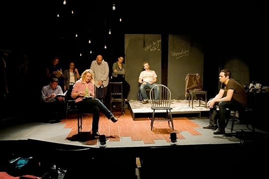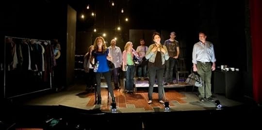 Cast of LaramieAnd this is one of the reasons I applaud Artistic Director Brandon Walker and Managing Director Erin Cronican who co-directed this production. They understood the importance of history. That one must be reminded so as not to repeat it. And what an incredible production they have in this small space on the 4th floor of a building where the story feels as timely today as when the horrible tragedy first happened. This fine ensemble of actors change seamlessly into different characters as they allow the people of Laramie to tell their story through monologues. Both Walker and Cronican are part of the 8 member ensemble and each actor brilliantly maneuvers their way across the terrain of diverse characters - bringing each to life. This is not a show in which one calls out one over another because they all carry so much weight, so much importance - and not a weak link in the bunch. Traveling to prop tables and clothes racks to morph into different ages, genders - real people…the ensemble is always in character no matter where they are on stage. I was spellbound of how they managed to transport us with few set pieces, string of lights to represent the vast night sky - and that chalkboard wall: wow. Powerful theater.