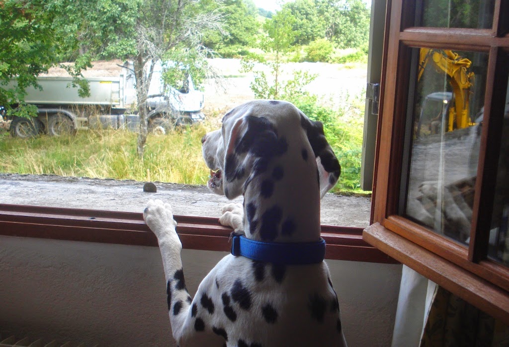 Holidays are a good time for reading. My latest is, or was, The Woodcutter by Reginald Hill, all 550-odd pages of it (in paperback format). It was interesting, with a slow-burn curiosity rather than a gripping must-know-NOW feel to it. The opening chapters hung together but only just and in the weirdest way that is only explained by the very last chapters. If I had not been on holiday, with lots of leisure, I might not have continued with it, though having one of the narrators be a criminal psychiatrist was an interesting touch.It is 10.15pm and the light has finally gone out of the sky. I forgot to do my blog this morning and the reason for that is Wimbledon, so I'm doing it now. There is always something to keep an eye on, hence the pic on the right. The days are busy with small things, such as walking Tim, weeding, swimming, making meals and sweeping the dust out of the house every day. With the heat so tremendous, we have most windows open all the time, and the dust blows in, especially if the digger boys are here, as they were yesterday afternoon. Today - not a sign of them. It would be good if they would just finish the job, and then we could do some tidying up once they've gone. But one digger is still here, poised by the pond, no doubt frightening the frogs into fits and the hay field is reduced to blank soil. Behind the house, the patch called the garden - more in hope than reality - is like a rough sea, all hills and hollows. It obviously needs more work.