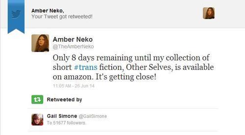 Let me tell you that this is probably the most awesome retweet I’ve ever had. Gail Simone, aside from being a great writer, is also the first person to write a trans character in a major comic book (Batgirl), and has done a lot of work that is just… awesome. Awesome is the word. Not only that, but it’s Gail ‘fricking’ Simone. This wonderful lady, has just retweeted me on my upcoming book release. Not just some random book, but a book by a ‘mostly’ unknown trans author, about trans stuff.