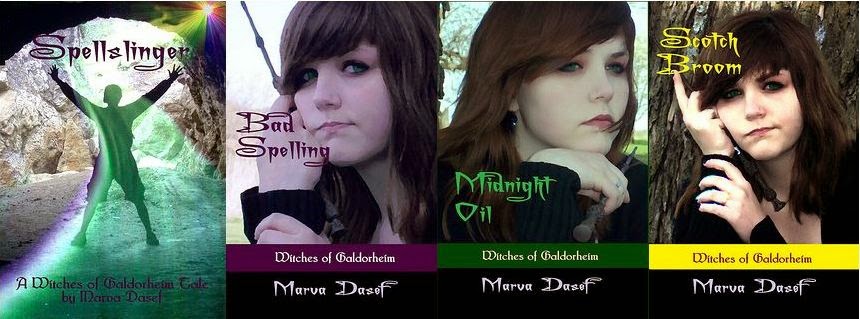 Bad Spelling: http://www.amazon.com/dp/B00JKQN7XW/Midnight Oil: http://www.amazon.com/dp/B00JKQXIFY/Scotch Broom: http://www.amazon.com/dp/B00JKR8XRG/Spellslinger: http://www.amazon.com/dp/B00DKABHC2/