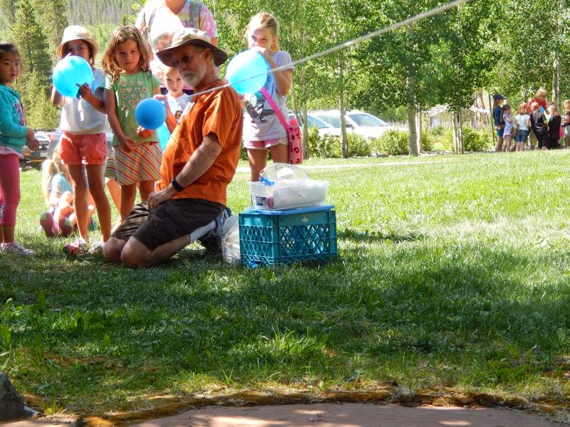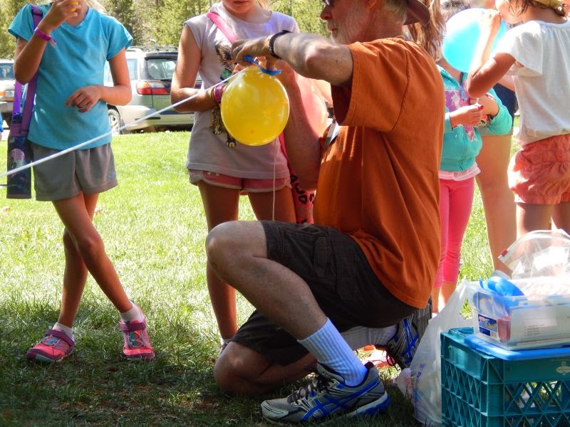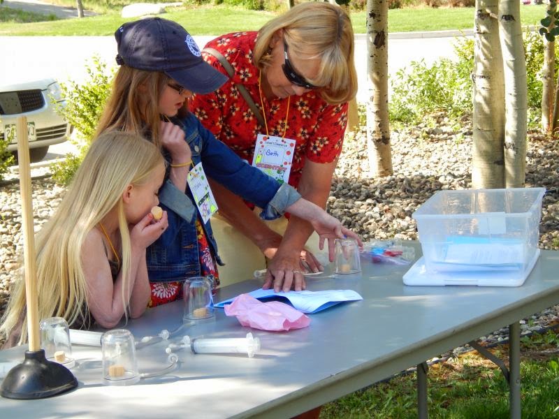 My husband Neil and I have a longstanding interest in encouraging children to read and write and to mess around with science. When we lived in Colorado Springs, for instance, I occasionally met with the teen writing group at the local library to pass on information, such as how to write a query letter, and to help them critique each other's writing. Also, Neil was a volunteer science fair judge. So, when the Summit County Library System initiated it's "Fizz Boom Read!!" summer reading program this year to encourage children to both read and explore science, we were happy to sign up as volunteers. On July 9th, we manned two of ten science stations at the Frisco library that engaged children in experiments with air pressure.