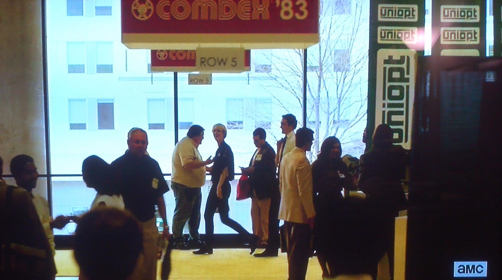 Bobby and Cardiff Electric crewI was an extra on episode 9 of AMC's TV series, Halt And Catch Fire. Episode Nine takes place partly at the 1983 Comdex Convention in Las Vegas. The shoot took place in a couple of different location in Atlanta, GA a few months back, before the first episode had aired. It was either late February or early April. I do remember it was chilly outside when I arrived early each morning. My dates are a little fuzzy.I worked on the shoot for three days and had a fun time, although my feet were killing me at the end of each day after many hours standing and walking on hard surfaces. Oh, the pains of just being there, huh? :) I also spent some time fake drinking, fake smoking, and fake picking up women at the bar. I also had a lot of fake conversations on the con floor and got to fake flirt with the porn stars turned booth babes. Fun times. It was also my first time filming against a green screen, which was a neat experience. The shirt I wore was none to flattering, although it fit the era. It was a bit snug.