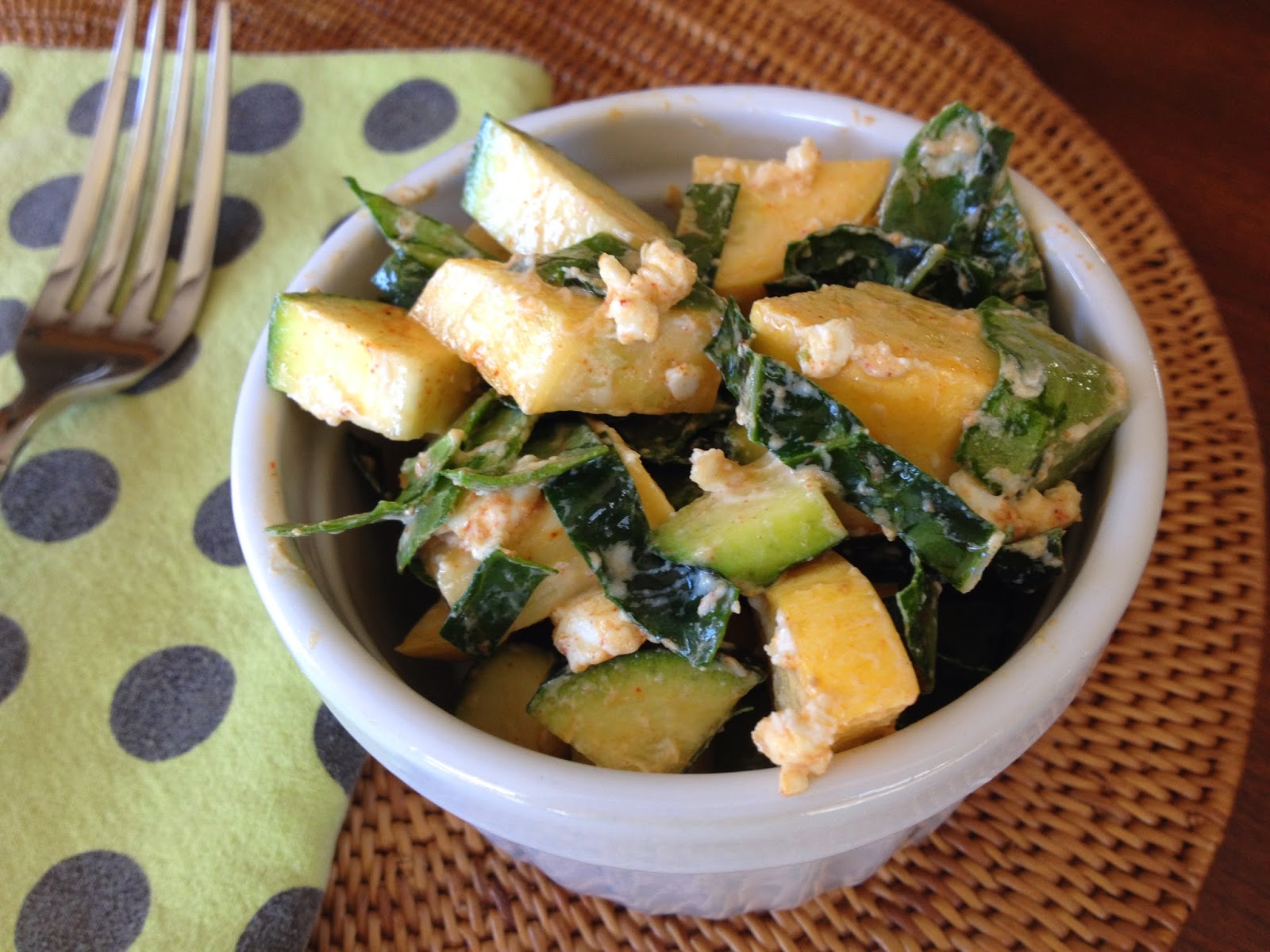 category Saladcuisine Raw, Veganingredients1 yellow squash, chopped1 zucchini, chopped1 handful spinach, chopped small1/8 C crumbled goat cheese feta1 leaf of kale, chopped small1-2 shakes smoked paprikaDressing