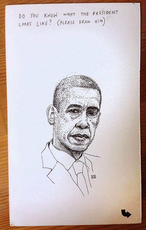 My nephew, age 7 asked "can you draw a centaur?" (the main character in the mini is, of course, a centaur, but not a very well-drawn example). I do sometimes take drawing dictation from these two, and so while I was drawing the centaur I asked what it should be holding in its hands. The answer: a picture of president Obama. Dialogue was also dictated.