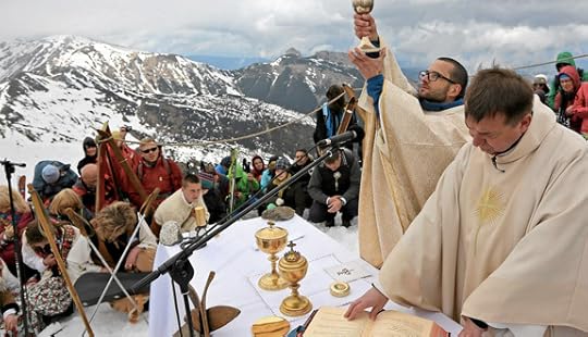 A priest raises the chalice as he celebrates Mass in honor of Sts. John Paul II and John XXIII in the ski resort Kasprowy Wierch in Poland's Tatra Mountains April 27, 2014. (CNS photo/Agencj a Gazeta/Marek Podmokly, Reuters)
