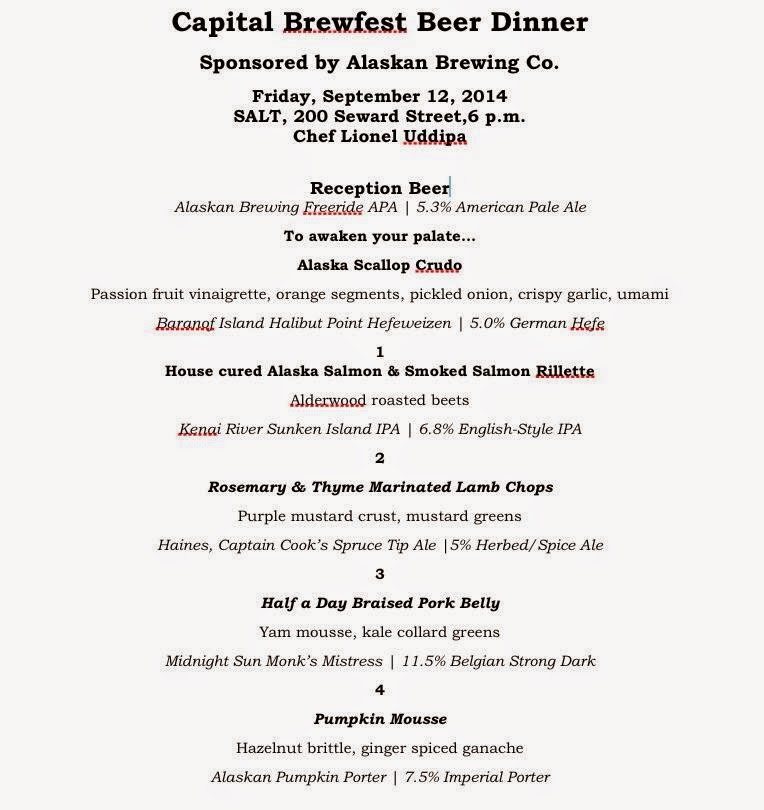 Also on Saturday, September 13th, will be  the 3rd Annual Capital City Brewfest; see details on their website. On Friday, September 12th, there will be a beer dinner at Salt in Juneau.  Here's the menu: