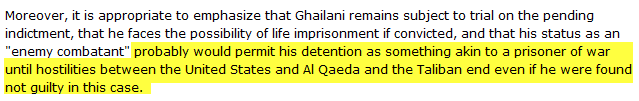 Then again, this whole spectacle of bringing Ghaliani to New York is quite like a show trial anyway. The Obama DOJ only deigned to allow Ghaliani a trial because it was convinced it was guaranteed of a conviction; had it not been so convinced, they would have simply sent him to a military commission or held him without charges of any kind, as they're doing to multiple other detainees against whom they don't believe they can win in a real court. Beyond that, the administration has already asserted what it calls "post-acquittal detention power": namely, the power to continue imprisoning anyone as an "enemy combatant" under the law of war even if they charge that person with crimes and lose in court. Indeed, Judge Kaplan -- seemingly eager to assure the public that he wasn't endangering them with his ruling -- cited this claimed power in his decision:
