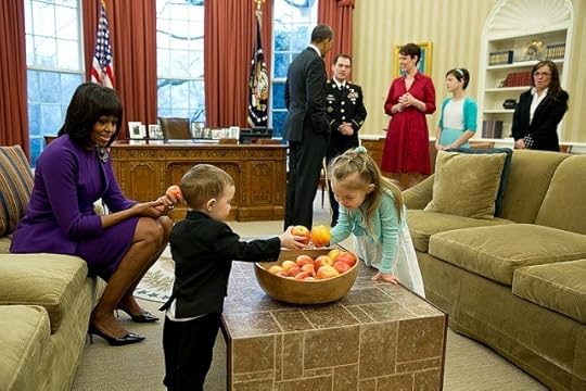 According to the White House: "The First Lady watches as the children of former Staff Sergeant Clinton Romesha choose apples in the Oval Office." Note: the apples all look the same.