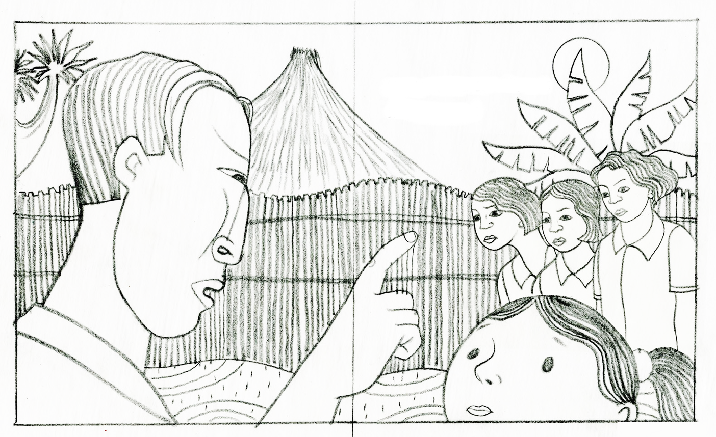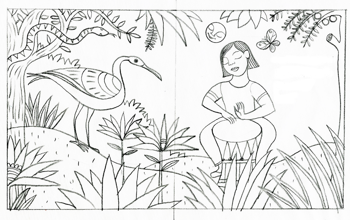 As an illustrator I don't want to reveal all the details too soon but stay in step with the unfolding story giving young readers the opportunity to fill those spaces in. As the prose unfolds jungle animals and objects bring dimension to the words. The story of this young girl reminded me of my own mother's struggles. She was in the first generation of female architects in Mexico and faced so much resistance even from her own family. In order to pursue her studies she took several side jobs and told her parents she was taking sewing classes. Her courage and persistence opened the glass ceiling. She successfully entered a male dominated profession in a traditional culture. I also grew up with three sisters and considered their relationships to each other when developing Milo's sisters who were part of an all girl band.