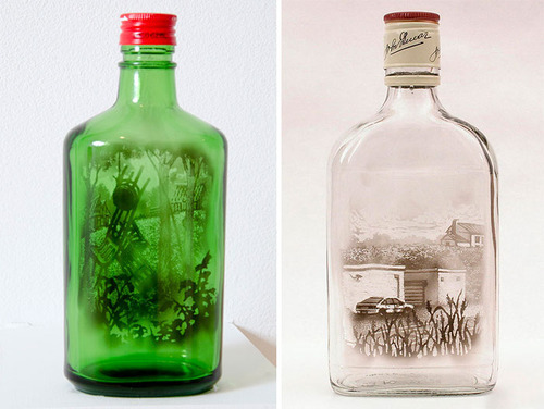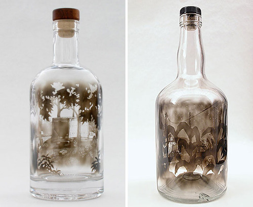 Jim Dingilian proves that a creative and skillful artist can create works of art with just about anything. By coating the interior of empty glass bottles with black smoke and then carefully brushing it away with tools mounted on dowels, he creates detailed and beautiful but dark works of smoke art that are dripping with a sense of suburban decay (via Bored Panda).