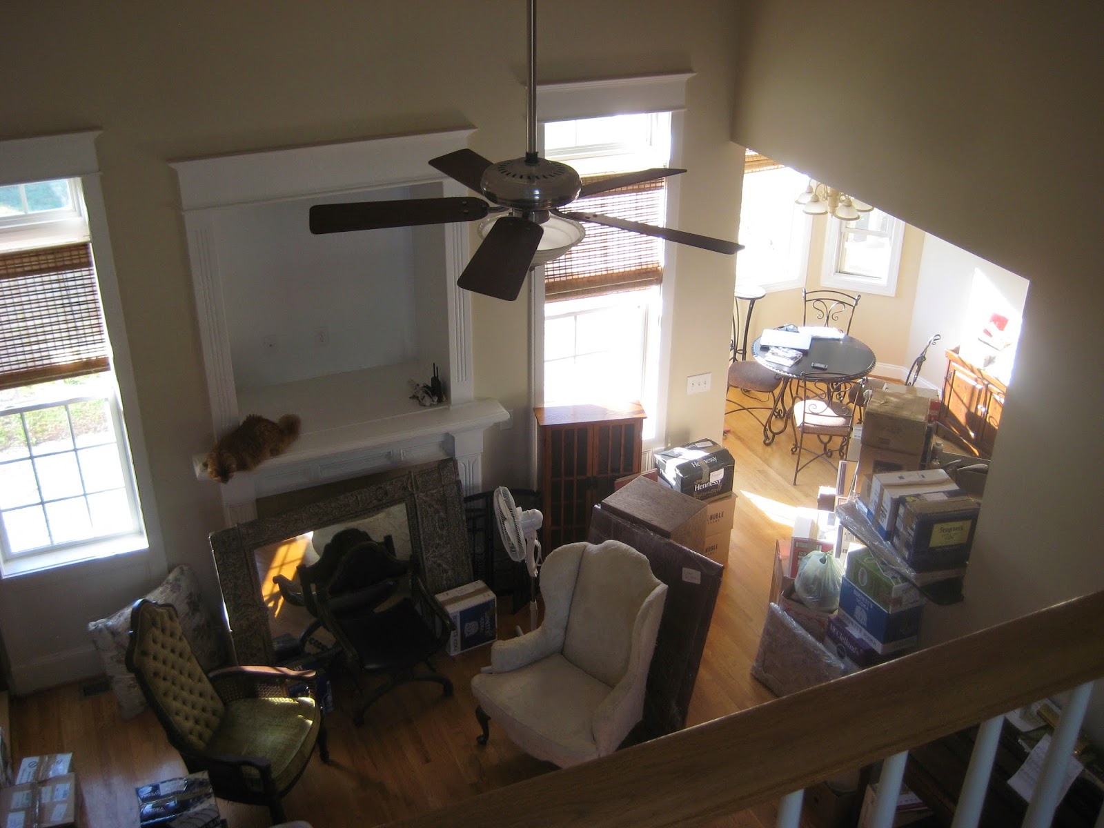 Actually, things are looking better than this by now. Not a lot, but a little better anyway. Much of the kitchen is unpacked, and other boxes have at least been rearranged to create walking space. But wow . . . it's a work in progress to say the least!