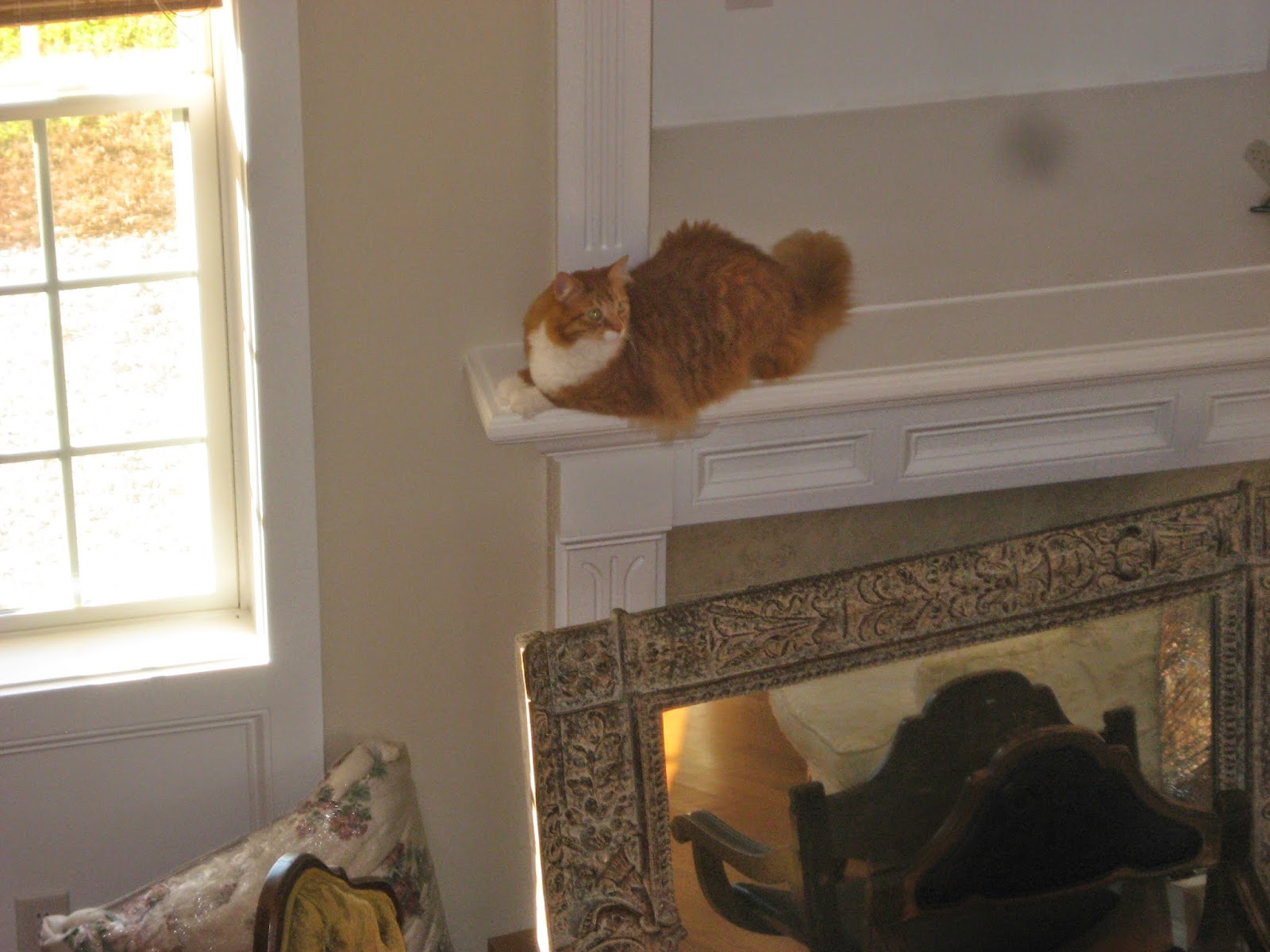 Rohan and I had wondered how we would fill that big empty space above the fireplace, but we needn't have worried. Monster has it all figured out for us! (And really, could we ask for a better decoration?) The kitties all like to take turns lounging up there, so I suppose that means we decorate with "living art." Hey, it works! (Though we'll probably go with something a little more normal-looking later on. Rohan's been looking at beautiful canvas prints of St. George slaying the Dragon . . . )