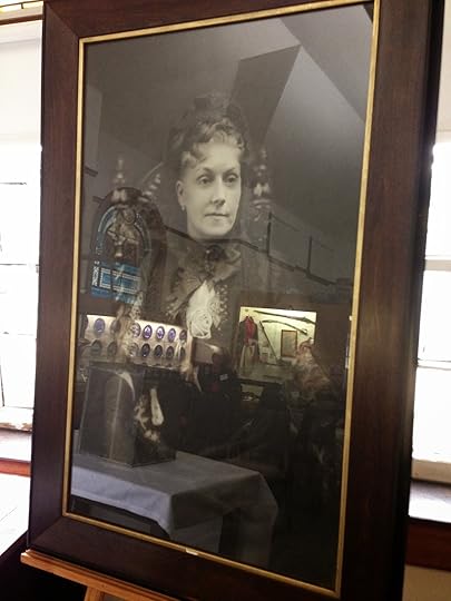 The portrait of Abby Day Slocomb, the first regent of the Anna Warner Bailey Chapter, National Society of Daughters of the American Revolution, amid reflections of the artifacts in the Monument House Museum at Fort Griswold , which she helped organize.
