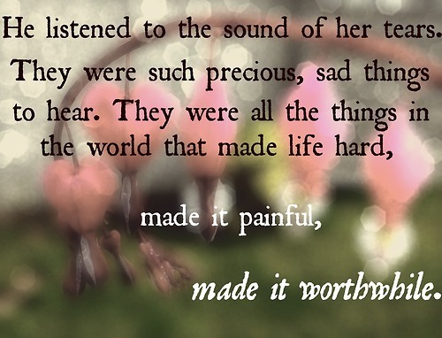 "He listened to the sound of her tears. They were such precious, sad things to hear… They were all the things in the world that made life hard, made it painful, made it worthwhile."—- Desiderium: The War Within by Katherine Frances, Chapter 22.