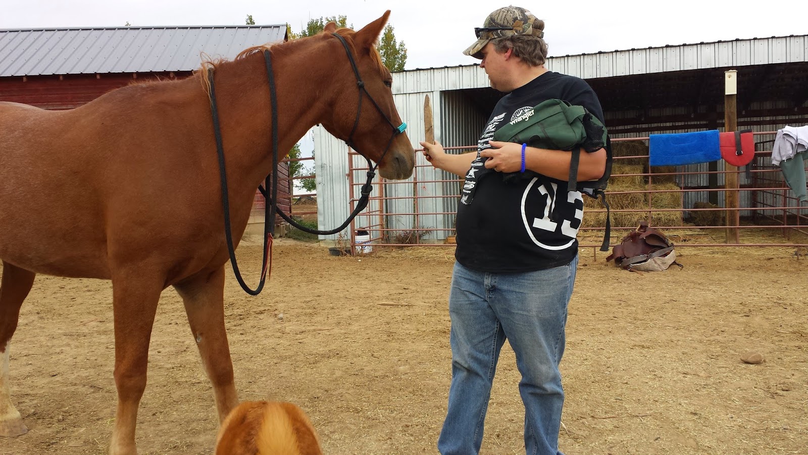 Bill put some weight on Skeets while she had the saddle on and she didn't offer any attitude, so I climbed on.  We didn't ride, just sat, but she wasn't bothered.