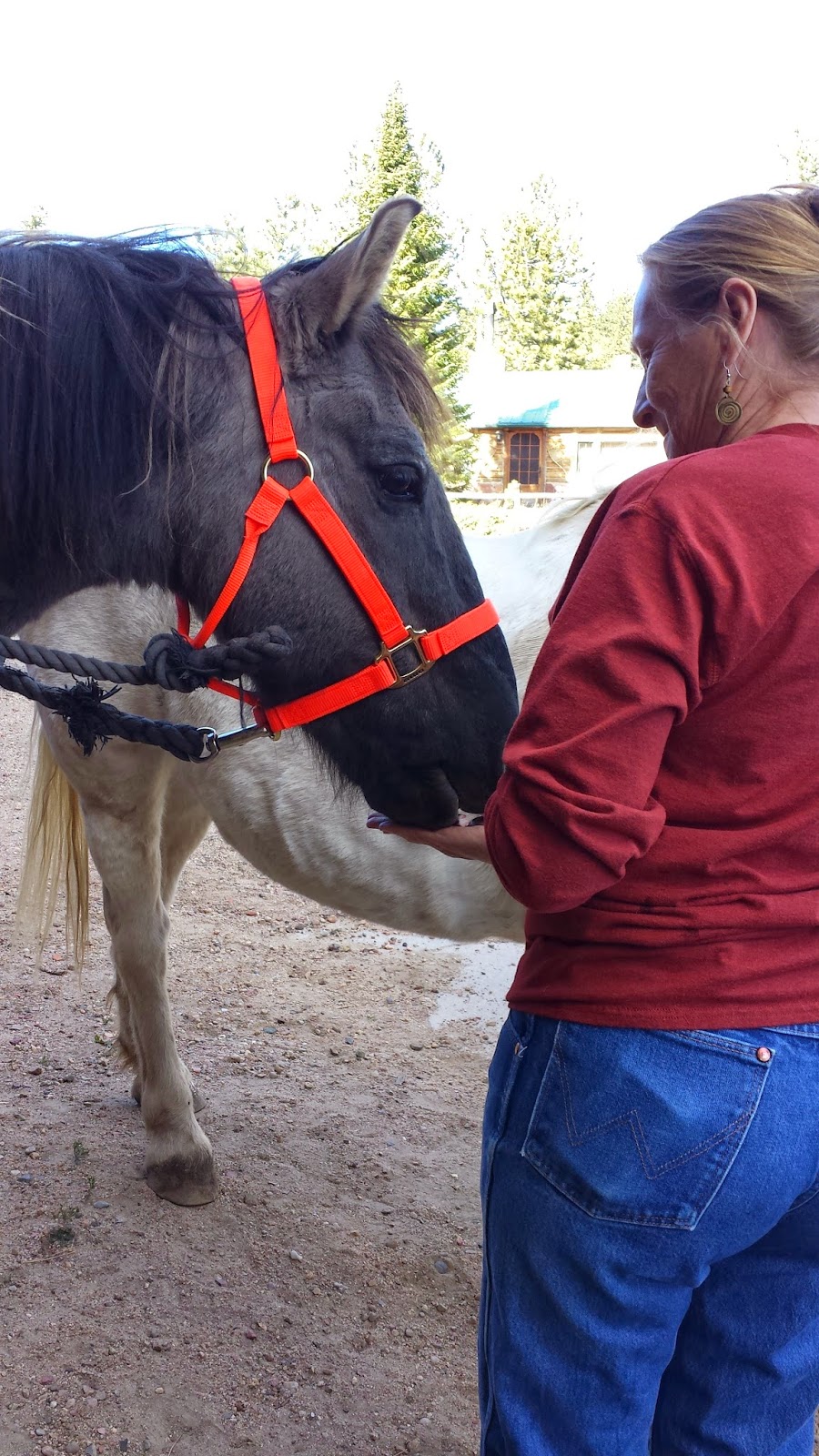 It almost looks like Ranger has tan lines.Mom, of course, had treats for the poor, abused beasts when we got back and handed them out. None of her horses had ever tasted peppermint, but they all agreed that peppermint is pretty yummy.