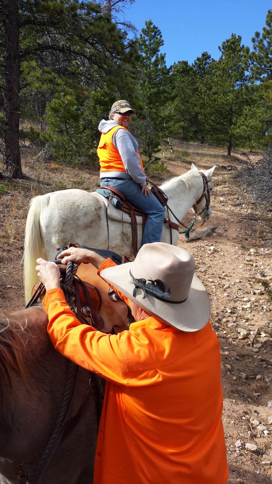 I finally found a place to re-mount, checked the cinch, which was a bit loose, but didn't think anything about it until I put my weight in the stirrup. My assessment of a "bit loose" was maybe an underestimate. I took six inches out of the cinch. No wonder she didn't want to go down the hill with the saddle that loose. Once I tightened it up, we didn't have a single problem the rest of the ride.