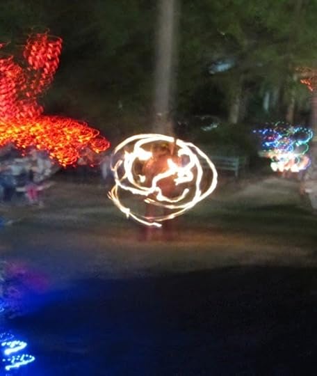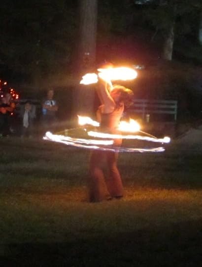 She was a fire dancer, tucked over in a circle of grass within the flower show.  She didn't have the audience that the pot-bellied pig races could draw, but that was part of the magic.  As she danced and wove through the air, her tumbling torches became fire wisps, and her spell quieted little ones and muted conversation.  We were still.