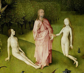 of The Garden of Earthly Delights.This view of the piece is further reinforced by its exterior painting, a depiction of the Earth during its creation, specifically on the third day, after the creation of vegetation. The world exists as a vast and empty place, painted in a monochromatic grey-green that blends rock and plant together to where it is impossible to tell where one starts and the other leaves off. Encased within its crystalline globe, the world is silent. But in the upper left of the image sits God, overseeing the world’s creation. But within this image God is dwarfed by his creation, barely the size of a single tree or rock within it. It is the vacant earth and the beginnings of teeming life that grow within it that dominate the scene, even before man is placed within it in the first panel. This sense of a vast and teeming planet is present even in the first panel, where Adam and Eve are surrounded by wondrous beasts, birds wind their way through an ornately carved rock formation, and out of the waters of Eden rises an extravagant fountain with clear resemblance to the phallic towers of the second panel. And even in Eden, sex and death are present - throughout the panel the beasts feed upon each other’s flesh, and Eve’s posture as she is presented to Adam, thrusting chest and hips forward as she kneels before him, speaks volumes.