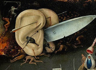panel of The Garden of Earthly Delights.Given the sense of vastness given to the earth and the life within it, the second panel of humanity and nature cavorting in harmony seems almost wholly inevitable. Indeed, it seems like the natural moral conclusion to what appears in the previous two images. The lushness of the material world is presented as being so vast as to exceed the scope of its creator. If this is so, what possible purpose could humanity have beyond surrendering their bodies to the world. In this reading, the final panel is not a consequence of the center panel, but an alternative - a fact highlighted by the breaking of the skyline that stretches over the first two panels. It is telling, after all, that the people being tormented in hell appear to be engaged in material pursuits: they are gamblers and musicians, and the nightmarish visions within hell come not from the natural world, but from human creation: knives, chamberpots, and musical instruments. It is only in hell that there is any depiction of civilization - a smoldering city that stretches out into the background, in marked contrast to the twisting towers of the Garden, which seem, like the transparent globes of fruit and the animal carapaces in which people burrow, to be as much products of nature as of man.