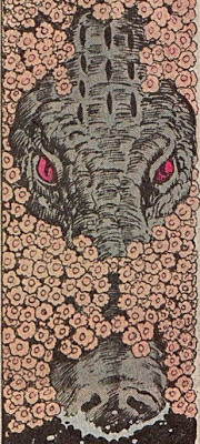 #54, 1986)Liz’s tentative steps towards independence in Dennis’s absence lead her to discover that Dennis had lied to her about Abby and Swamp Thing’s death, and causes her to seek out Abby, who has returned to Houma following Swamp Thing’s death. She is pursued, however, by Dennis, who ultimately chases Liz and Abby out into the swamp with a machine gun. Liz ultimately works her way around a flower-covered bog, which Dennis foolishly runs into, sinking underwater and water logging his gun. As he advances upon them, boasting about how he “waded through puddles wider than this in ‘Nam” and telling Abby that she “spoiled a beautiful romance, bitch, and I’m gonna club your brains right out.” But as he gloats a crocodile advances out of the swamp towards him, and ultimately he’s ripped apart by the animals, saving Liz and Abby. What is really significant, however, is the panel in which the crocodile makes its appearance, slowly emerging amidst the flowers, which spread across his snout so as to frame his red eyes and nose into a mirror of Swamp Thing’s iconic visage, thus tacitly admitting that Swamp Thing remains alive.