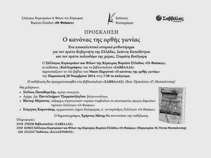 Το ταξίδι του "Κανόνα της ορθής γωνίας" συνεχίζεται. Μετά την Κέρκυρα, την Λευκίμμη, την Αθήνα και την Πάτρα, σειρά έχει η γενέτειρα της αγαπημένης μου μητέρας, Θεσσαλονίκη, όπου στις 28 του Νοέμβρη, στο Βιβλιοπωλείο "Σαββάλας" θα παρουσιάσουμε το βιβλίο στο αναγνωστικό κοινό της συμπρωτεύουσας. Την εκδήλωση αγκάλιασε από την πρώτη στιγμή ο Σύλλογος Κερκυραίων & Φίλων της Κέρκυρας Βορείου Ελλάδος "Οι Φαίακες". Το πάνελ των ομιλητών θα τιμήσουν δυο εξέχοντα μέλη του Συλλόγου "Οι Φαίακες", οι κ.κ Βίκτωρ Μέριανος και Γεώργιος Κορωνάκης καθώς και ο πρώην υπουργός κ. Στέλιος Παπαθεμελής και ο αρχιμ. Παντελεήμων Τζορμπατζόγλου. Τον συντονισμό της εκδήλωσης θα αναλάβει ο δημοσιογράφος κ. Χρήστος Μάτης.