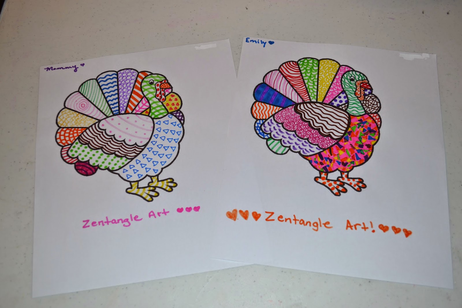 To start off our pre Thanksgiving festivities, Emily and I worked on some Zentangle art. Normally Zentangle art is black and white and is made by using repetitive patterns, but we decided to make a variation of the idea after I saw a Zentangle turkey on Pinterest. On the post I looked at, they had simply copied some blank turkey coloring pages and then started making patterns with colored markers. I think our efforts turned out pretty well, how about you?