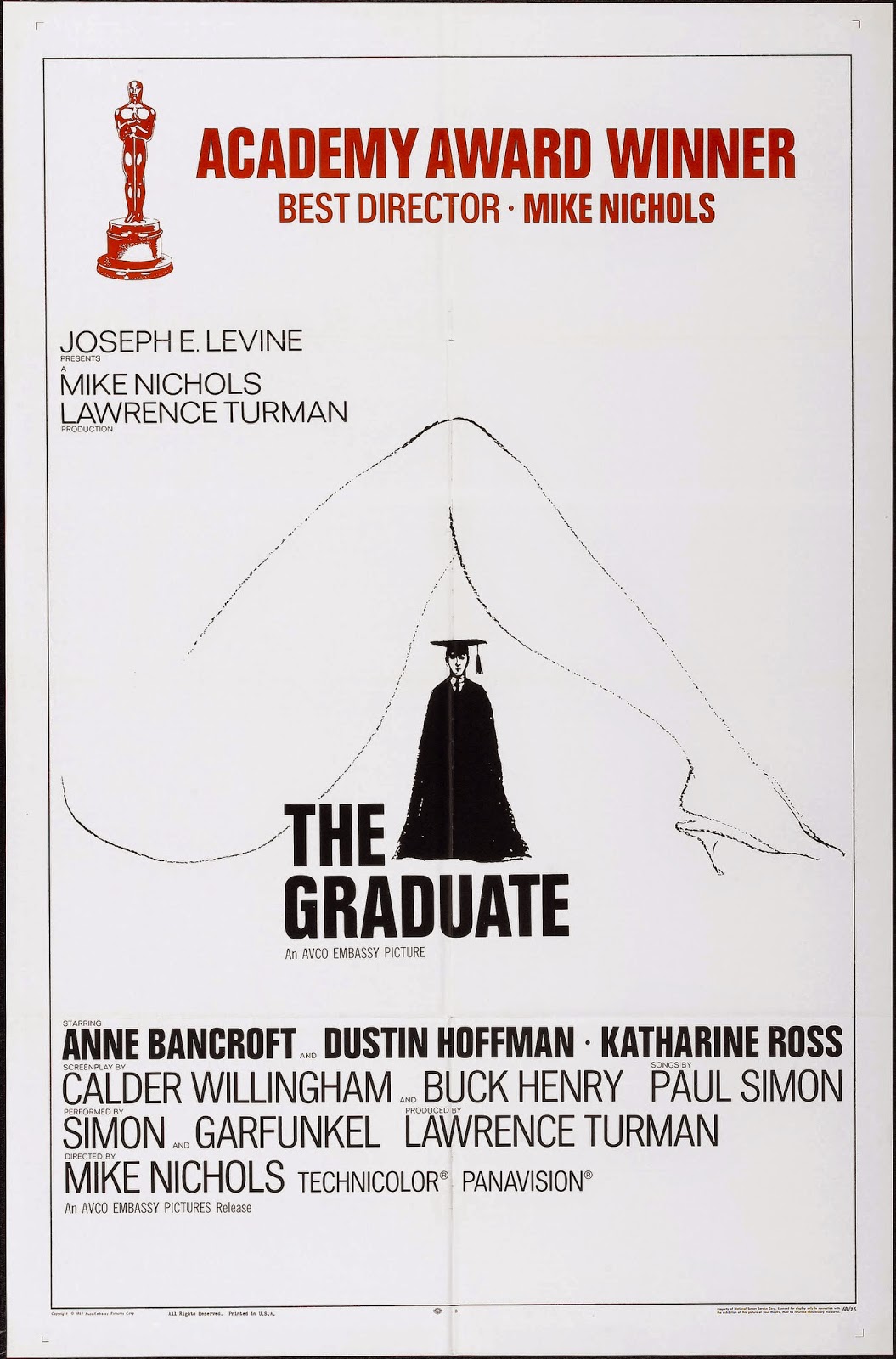 The feisty young producer LarryTurman was smart enough to see that Nichols, then making a splash as a stage director of Neil Simon comedies, was just the guy to film Charles Webb’s quirky novel about a young college grad who sleeps with his father’s partner’s wife and then falls in love with her daughter. Turman admired Nichols’ fearless spirit, and Nichols obliged with some gutsy moves. Like bringing in comic actor Buck Henry, who had never before written a screenplay, to adapt Webb’s novel, And choosing to score The Graduate with an existing pop album by folk duo Simon and Garfunkel, the first time this now-familiar technique had been tried in a Hollywood production. Most gutsy of all, Nichols gave the leading role to an unknown actor who was convinced – along with much of the entertainment world – that he was all wrong for the part.