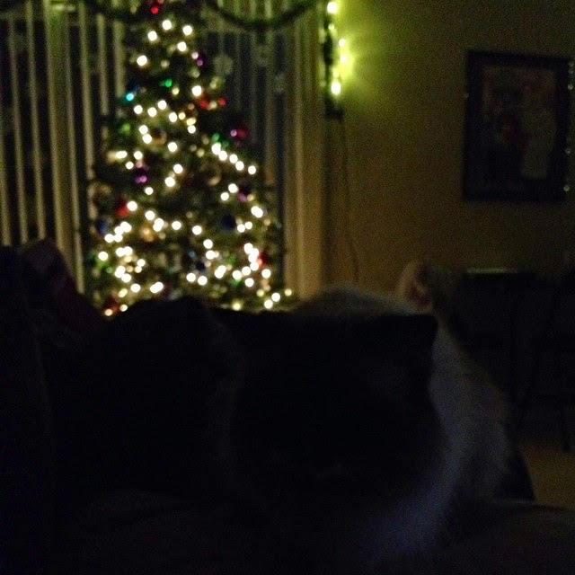 Day 11: Spend 30 minutes listening to Christmas music and enjoying the lights. (Jane photobombed the tree.)