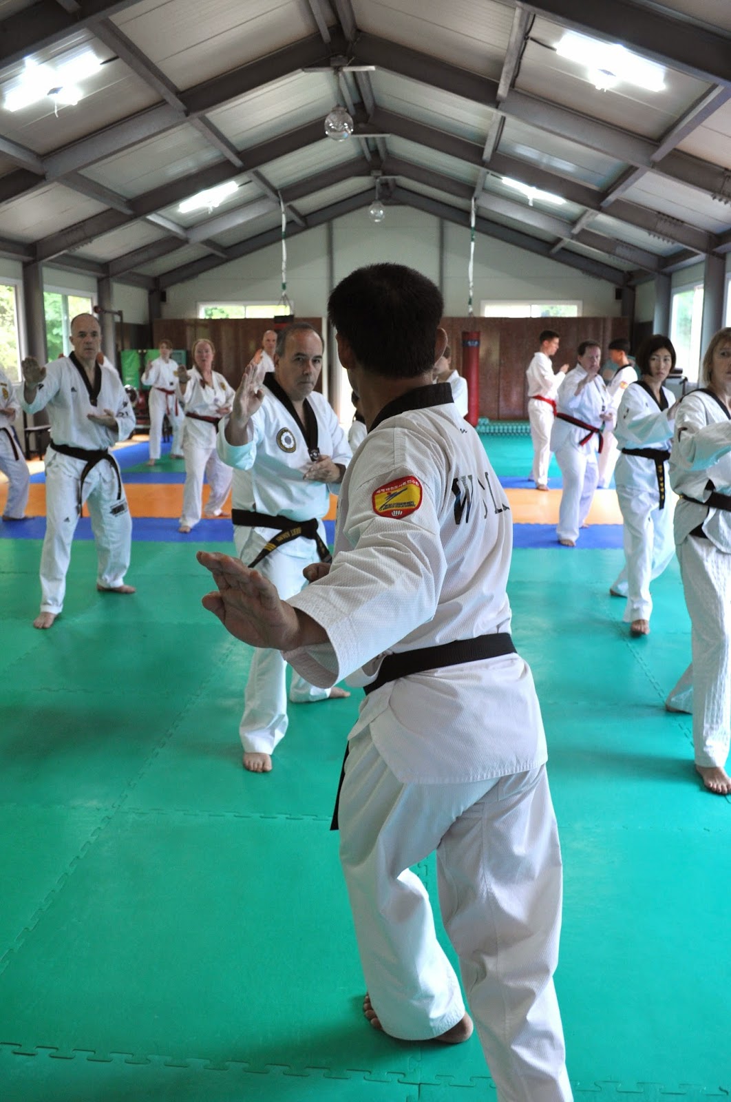 Master Cook and Grandmaster Leetrajectory and chamber. From the corner of my eye, I glimpsed my students receiving equal attention in analyzing the various Taegeuk poomsae, albeit with some minor alterations from what they have become accustomed to. Although the Palgweset is not given any credence, the eight Taegeuk, in tandem with the mandatory Kukkiwon black belt series poomsae, were thankfully addressed in great detail. One refinement that I found of interest was the first preparatory motion in poomsae Koryoconsisting of a pushing block, or momtang milgi makki. Having performed this form both in class, in competition on countless occasions and in the new DVD on the topic featuring Grandmaster Chun and myself, I had become use to projecting my hands forward with palms facing outward, thumbs a fraction of an inch apart, describing a triangle of sorts. Instead, Grandmaster Lee directed us to extend the hands forward as before, but with the palms turned inward and the thumbs slightly hooked similar to where they would be placed when executing a knife hand technique, or sonnal. Although the practical application of this block is to intercept an incoming head butt, it has several less obvious functions as well. In our DVD and in his autobiographical book, Taekwondo: Spirit and Practice, Grandmaster Richard Chun states that this technique, which he refers to as “barrel pushing block”, is a physical expression of firmness and resoluteness, demonstrating the confidence and strong will of the Korean people.