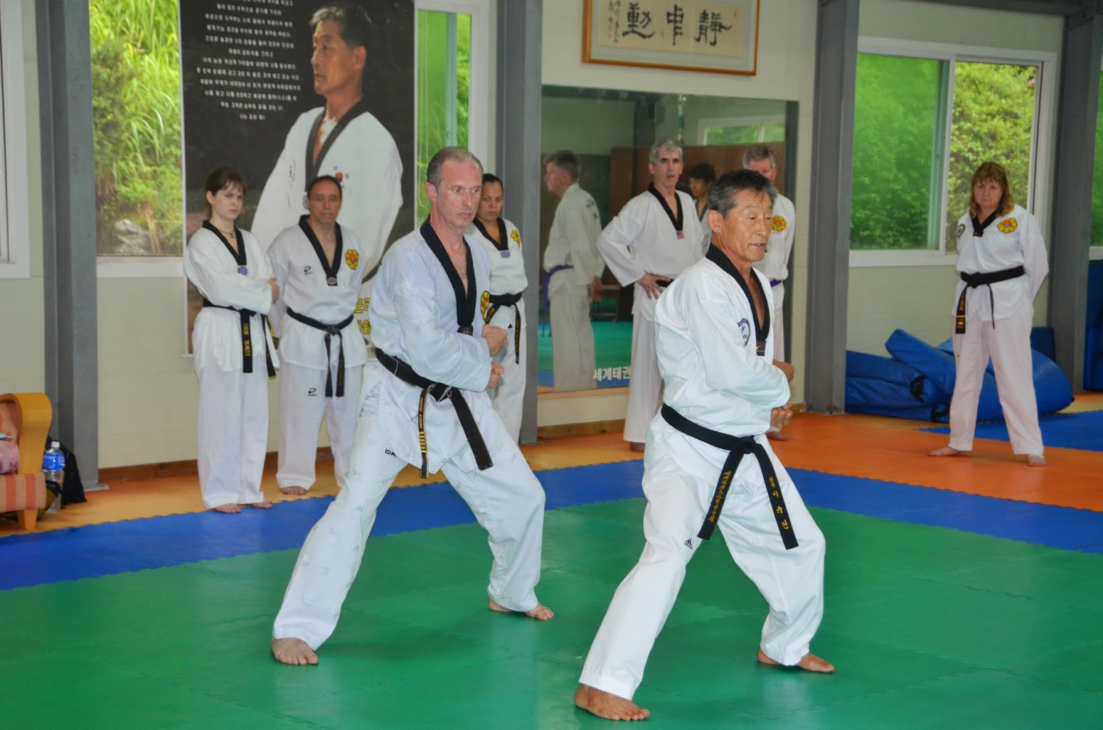 Rice paddies in front of Grandmaster Lee's dojangwas animatedly chatting with two gentlemen standing next to a Hyundai (pronounced “shunday” in Korea) sedan. I was suddenly overwhelmed with awe as I saw the grandmaster we had traveled over six-thousand miles to train with before me. Single file, my students lined up and bowed. It is then that the stern face I had only witnessed in photos and on film erupted into a broad, welcoming smile and Grandmaster Lee invited us to follow him and his instructors up a rutted dirt road. We passed a squat, single-story dwelling on our left that is his home, and then continue on a few steps to a red brick building with two sets of double doors thrown open to the outside that houses the grandmaster’s dojang and is headquarters to the World Taekwondo Instructor Academy. Inside, it was cool in stark contrast to the humid air that weighed heavy in the basin of the small valley. Instantly, we were enchanted by our surroundings. The floor was set with green puzzle-mat bordered in orange, and the walls adorned with memorabilia from a lifetime devoted to the Korean martial arts. In a neat row, over the doors, hung circular brass plates, tarnished with time, inscribed with the names of the original kwans, or martial arts schools established in the 1940s and 50s before the discordant styles were united to form taekwondo; names like the Moo Duk Kwan, Chung Do Kwan, and Oh Do Kwan, leapt out reminding us of the tenure and seniority Grandmaster Kyu Hyun Lee enjoys in the taekwondo community. Suspended on the far wall, in a black wooden frame, hung a scroll written in hangul characters reading: “A National Sport, Taekwondo”. Fifty of these icons were purportedly painted in the personal calligraphy of the late South Korean president, Chung Hee Park, father of the current president, in March of 1971. The majority, such as the one that was displayed before us, reside within the borders of Korea while the remaining few were distributed to master instructors throughout the world. One was exhibited in the New York City dojang of my teacher Grandmaster Richard Chun for over thirty years and, subsequently, was presented to our school as a treasured gift.