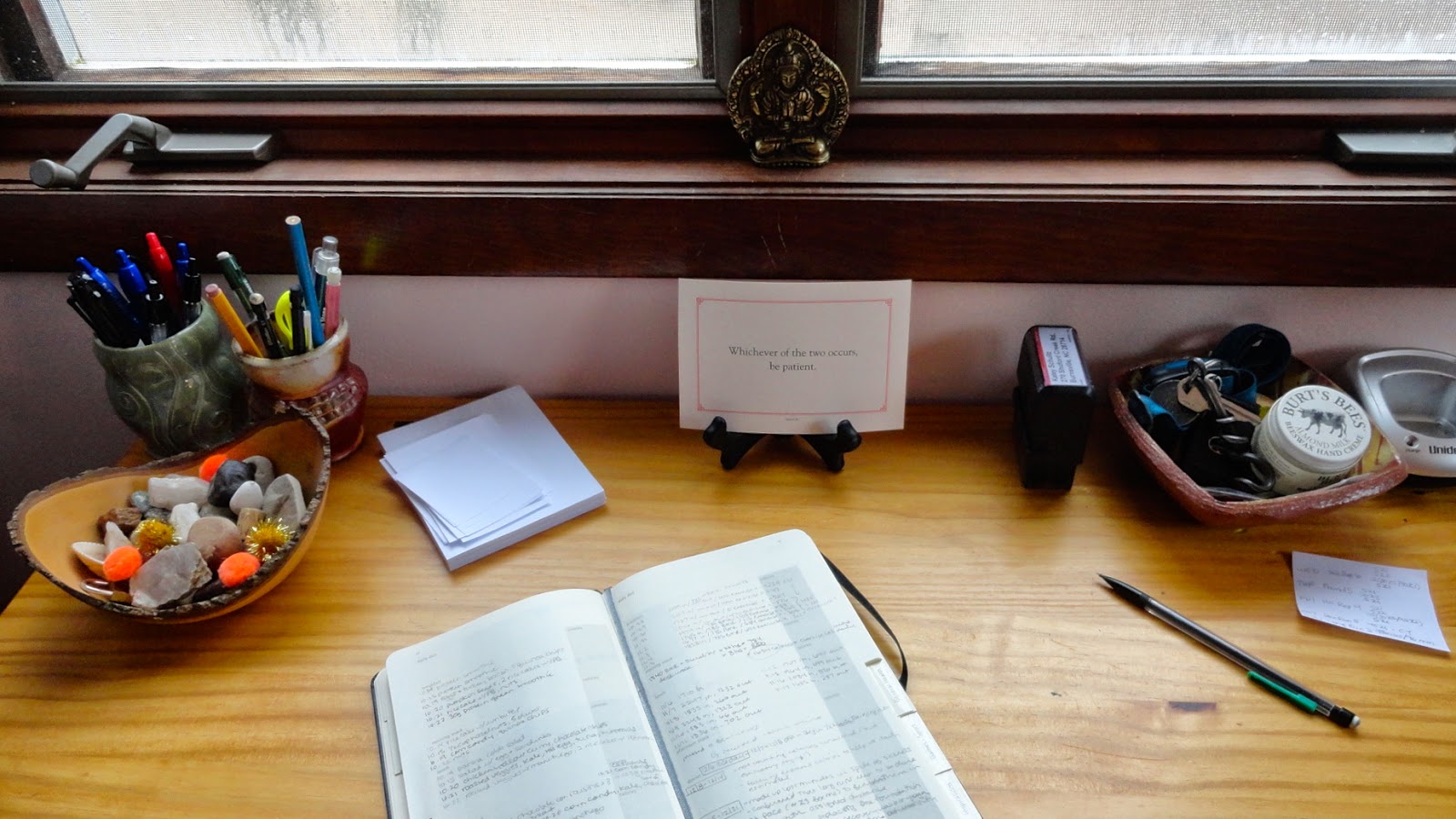 Here's a shot of my "brainstorming" desk. I try my best not to do "paid work" here. Only spiritual reading, journaling, working on the novel, or anything handwritten. My logbook shows months of training and works not only as a record, but a motivator as I track my progress. The Buddhist slogan card reads, "Whichever of the two occurs, be patient." I change these cards out every few days, enjoying the ponderings. What's not shown are any number of coffee table photo books that I like to flip through in the evenings, to relax my mind and eyes.