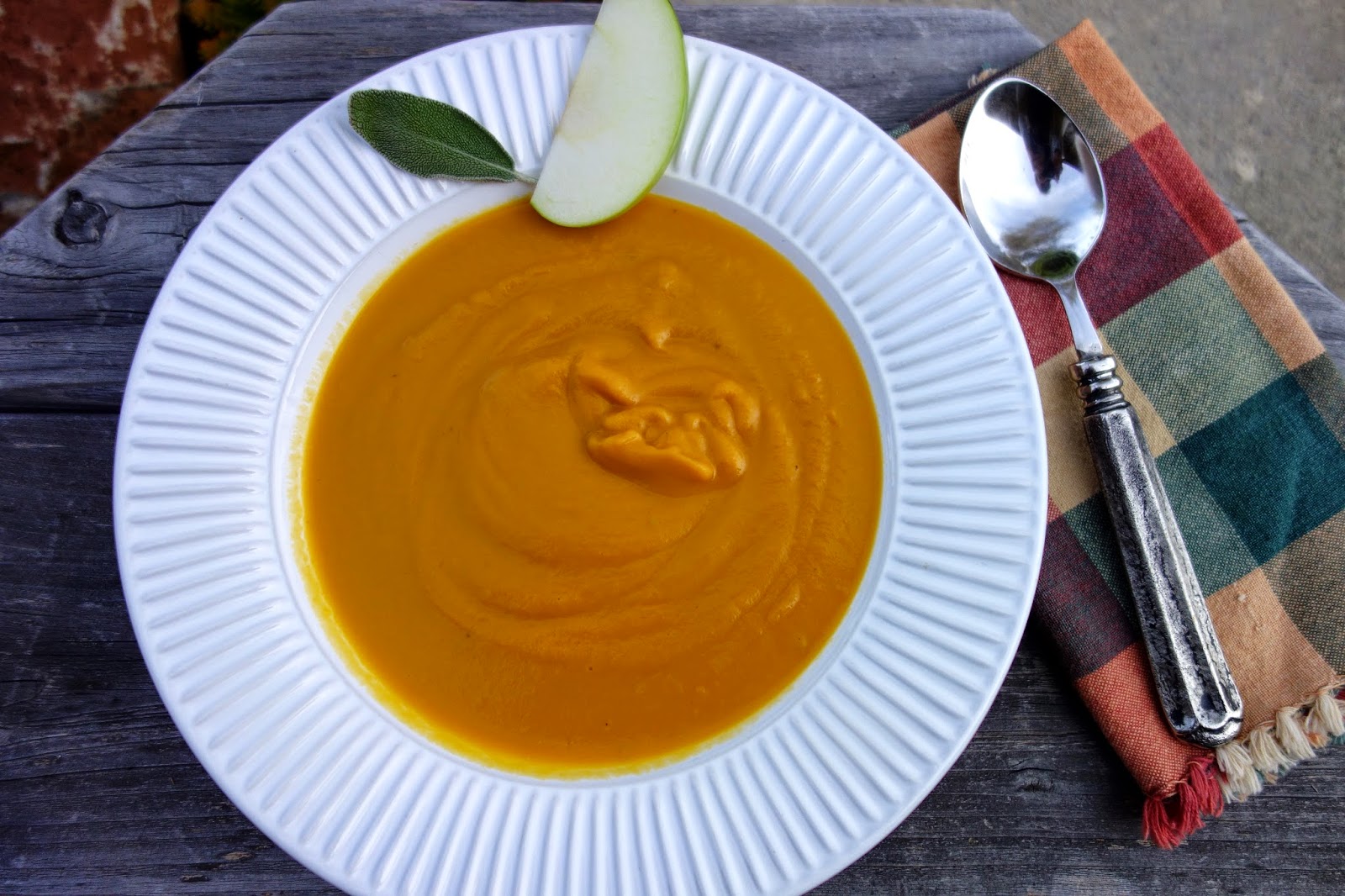 ingredients1 butternut squash about 8″ long1 Tbsp melted coconut oil1/4 C cashews, soaked6 sage leaves3 - 4 vegetable stock1 Tbsp coconut oil1 shallot, diced1 Granny Smith apple, cored and cubed1 tsp sea saltPinch of pepper