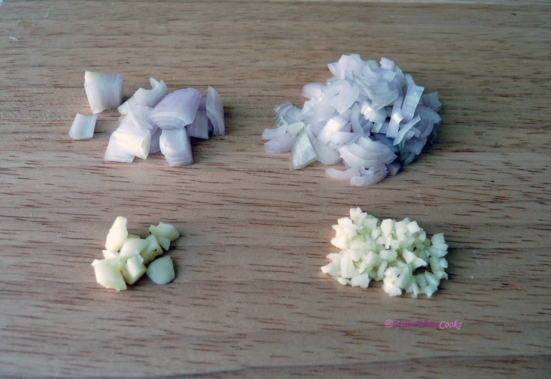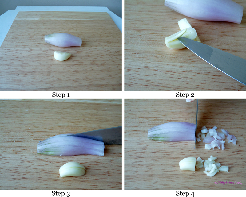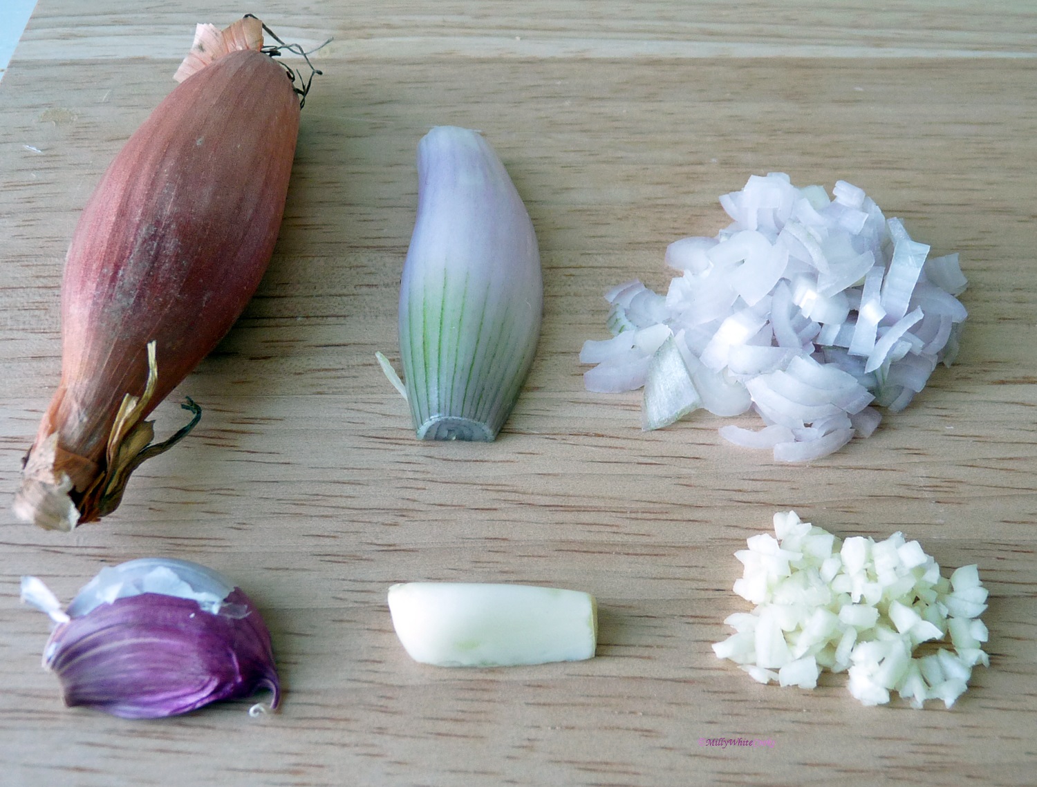 If you take a look at the photograph below, you will see that the shallot and garlic on the left are roughly chopped or diced, whereas the same ingredients on the right have been finely chopped or minced.