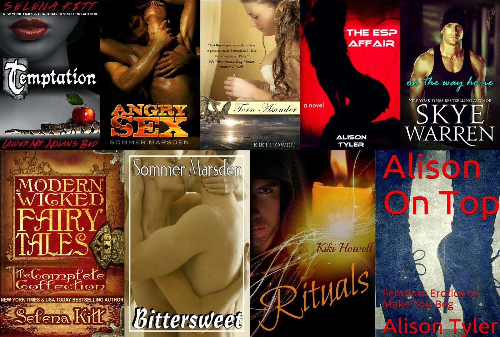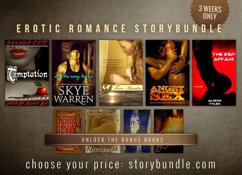 Curated by Kiki HowellI'm a fan of each and every author who graciously agreed to be included in this Erotic Romance StoryBundle, and so I will admit to being a bit star-struck to have my stories published beside theirs. As you will read, I met each one through a series of intertwining, very fortunate events.I've had the privilege to work with New York Times & USA Today Bestselling Author, Selena Kitt, since the beginning of my writing career. After first being published by her company, Excessica, I then began working for her in various aspects of the publishing industry. I consider myself very lucky to have learned so much from a writer as prolific as Selena, one of the best guilty pleasure authors out there with over a million books sold!Through working for Selena, I had the blessing of meeting, Sommer Marsden. Over time, and little "water-cooler" chats via emails if you will, we've found ourselves alike in a multitude of ways. I now have the honor of calling her a good friend even though we've never met in person. Referred to as "unapologetic" by another author in this bundle, I couldn't agree more with that description of her writing. Her stories are both profound and witty, sexy and fun with a myriad of characters from a to z, adventurous women to zombies, and back again.Thanks to one of Sommer's social media posts, I signed up to review one of Alison Tyler's books, and I've been hooked by her writing ever since. A prolific writer of several stories and talented editor of many kinky anthologies, her works offer passion and heart along with vital doses of all things sexy. Just following her blog, appropriately titled, Trollop with a Laptop, is exquisite fun, a true indulgence.It was also through Selena that I was recently introduced to New York Times & USA Today Bestselling Author, Skye Warren. And, though I'm just getting started into her dark romantic fiction, I can't wait to indulge in more of her stories. Her work described with such words as "perversely tender" and "haunting and beautiful" I couldn't agree more. I've found her stories to be both complex and raw, emotional and enticing.I'm pleased with the wide array of genres represented by these authors and their stories in this bundle. While all erotic romance, you will be further tempted with subgenres like: contemporary and historical, paranormal/pagan and fairy tales, bondage and femdom, to name a few. Enjoy! – Kiki HowellThe initial titles in the bundle (minimum $3 to purchase) are:The ESP Affair by Alison TylerTorn Asunder by Kiki HowellTemptation: Under Mr. Nolan's Bed by Selena KittOn the Way Home by Skye WarrenAngry Sex by Sommer MarsdenIf you pay more than the bonus price of just $10, you'll get another four books:Alison on Top by Alison TylerRituals by Kiki HowellModern Wicked Fairy Tales by Selena KittBittersweet by Sommer MarsdenThe bundle is available for a very limited time only, via http://www.storybundle.com. It allows easy reading on computers, smartphones, and tablets as well as Kindle and other ereaders via file transfer, email, and other methods. You get multiple DRM-free formats (.epub and .mobi) for all books!It's also super easy to give the gift of reading with StoryBundle, thanks to our gift cards – which allow you to send someone a code that they can redeem for any future StoryBundle bundle – and timed delivery, which allows you to control exactly when your recipient will get the gift of StoryBundle.Why StoryBundle? Here are just a few benefits StoryBundle provides.Get quality reads: We've chosen works from excellent authors to bundle together in one convenient package.Pay what you want (minimum $3): You decide how much these fantastic books are worth to you. If you can only spare a little, that's fine! You'll still get access to a batch of exceptional titles.Support authors who support DRM-free books: StoryBundle is a platform for authors to get exposure for their works, both for the titles featured in the bundle and for the rest of their catalog. Supporting authors who let you read their books on any device you want—restriction free—will show everyone there's nothing wrong with ditching DRM.Give to worthy causes: Bundle buyers have a chance to donate a portion of their proceeds to charity. We're currently featuring Mighty Writers and Girls Write Now.Receive extra books: If you beat our bonus price, you're you're getting nine total books!StoryBundle was created to give a platform for independent authors to showcase their work, and a source of quality titles for thirsty readers. StoryBundle works with authors to create bundles of ebooks that can be purchased by readers at their desired price. Before starting StoryBundle, Founder Jason Chen covered technology and software as an editor for Gizmodo.com and Lifehacker.com.For more information, visit our website at storybundle.com, Tweet us at @storybundle , Like us on Facebook , and Plus us on Google Plus . For press inquiries, please email press@storybundle.com .