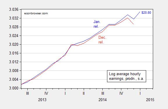 First, with the revised figures released on Friday, the drop in December hourly earnings was reduced to four cents; and the seven cent increase in January more than compensated for the drop (which some commentators attributed to calendar effects).