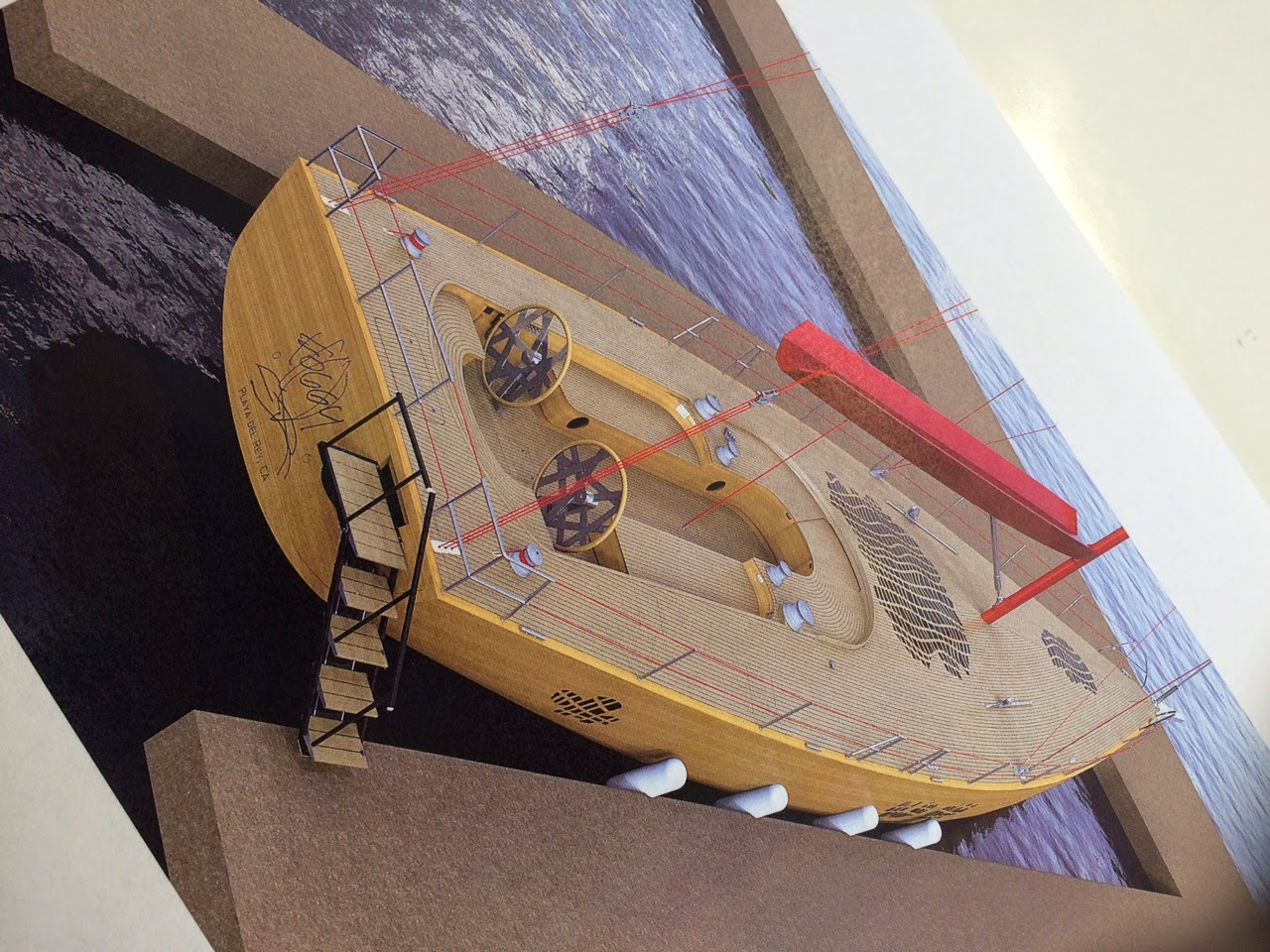 "Here is a CAD rendering of the 74' Germain Freres sloop being built for architect Frank Gehry at the Brooklin Boatyard this winter. With 100 inches of snow down and counting, she has been a continuing source of entertainment for the cabin fever afflicted crowd. And Oh Yeah! Those little black shapes will have individual pieces of glass set in them...all 862 of them. And those steering pedestals, they will be fabricated in titanium by Boeing's 3D printer. Needless to say, Frank has had a lot of input in "Foggy's" aesthetic. She'll be launched in May. Operators are standing by to take your order." -BM