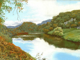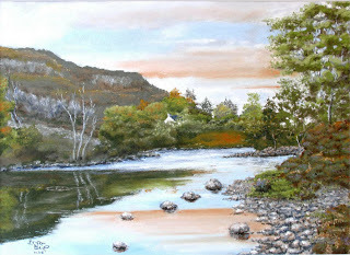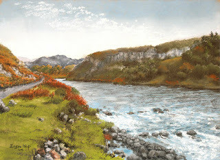 Actually I was able, with a lot of help from my lady, to turn disaster into some kind of a triumph, for we have sold hundreds of greetings cards bearing the two upstream river Ewe pastels. Also my booklet, 'An Incomer's Views ON WESTER-ROSS in 24 Paintings, Poems and Narratives' which includes this pair. 4000 copies sold to date.