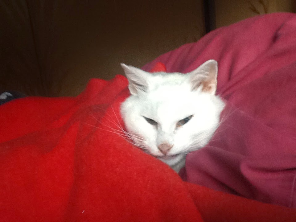 Leo and FearlessLeo was one of them. Tiny, white, with wispy soft fur and sore sunburned ears. Got him home, and he ate, and then drank and drank water, ate as much as he could hold, and passed out on the couch asleep.